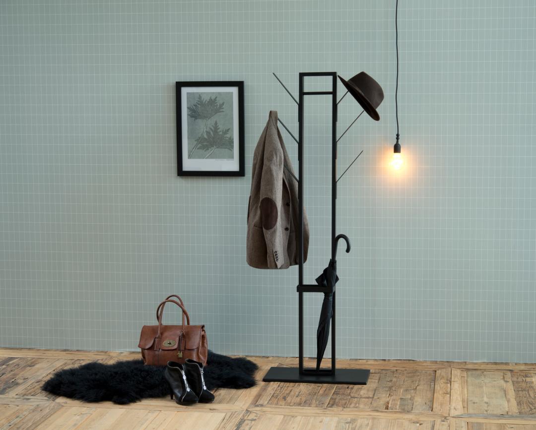 Compagno sottile e silenzioso, che si prende cura dei suoi cappotti, giacche e accessori nel momento in cui entra nell'ingresso. Il classico stile ad albero è stato aggiornato in chiave industriale con il metallo verniciato a polvere. È anche un materiale di facile manutenzione. Realizzato in nero, si abbina bene ad altri colori. È disponibile in una dimensione compatta, grazie alla quale si adatta anche agli spazi più piccoli.
