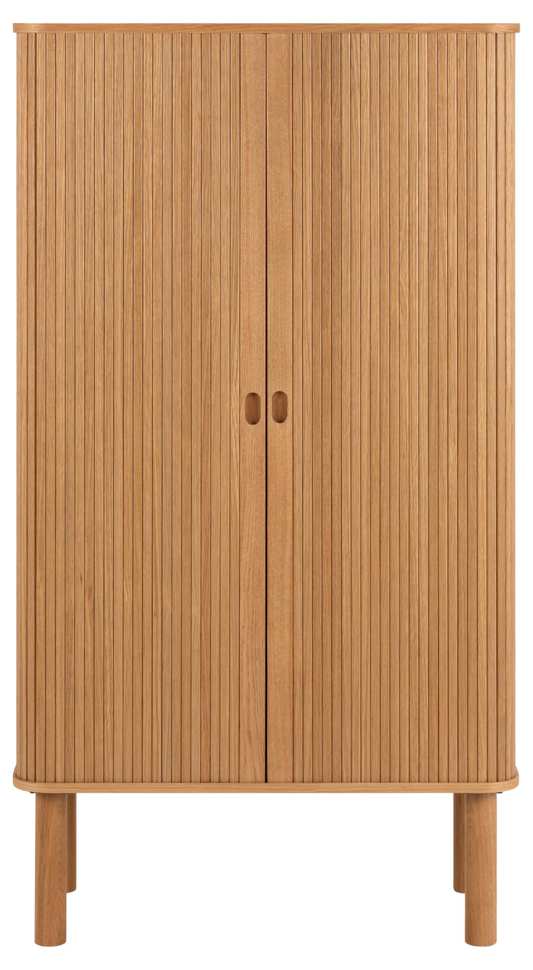 Archivio Langley, piano e struttura in rovere impiallacciato laccato PU, 2 ante in rovere impiallacciato laccato NC, 2 ripiani in melaminico rovere, base in rovere laccato NC, con frontale a lamelle, anta scorrevole e anta a tamburo, 80x40x145 cm