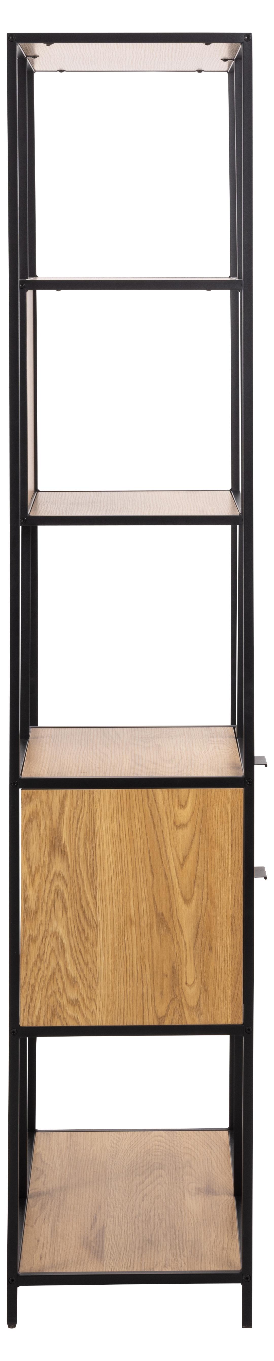Libreria Seaford, struttura e base in acciaio grezzo nero opaco verniciato a polvere, 2 cassetti e 4 ripiani in melamina grezza rovere selvatico opaco, con pannello posteriore reversibile e dettaglio asimmetrico, 77x35x185 cm