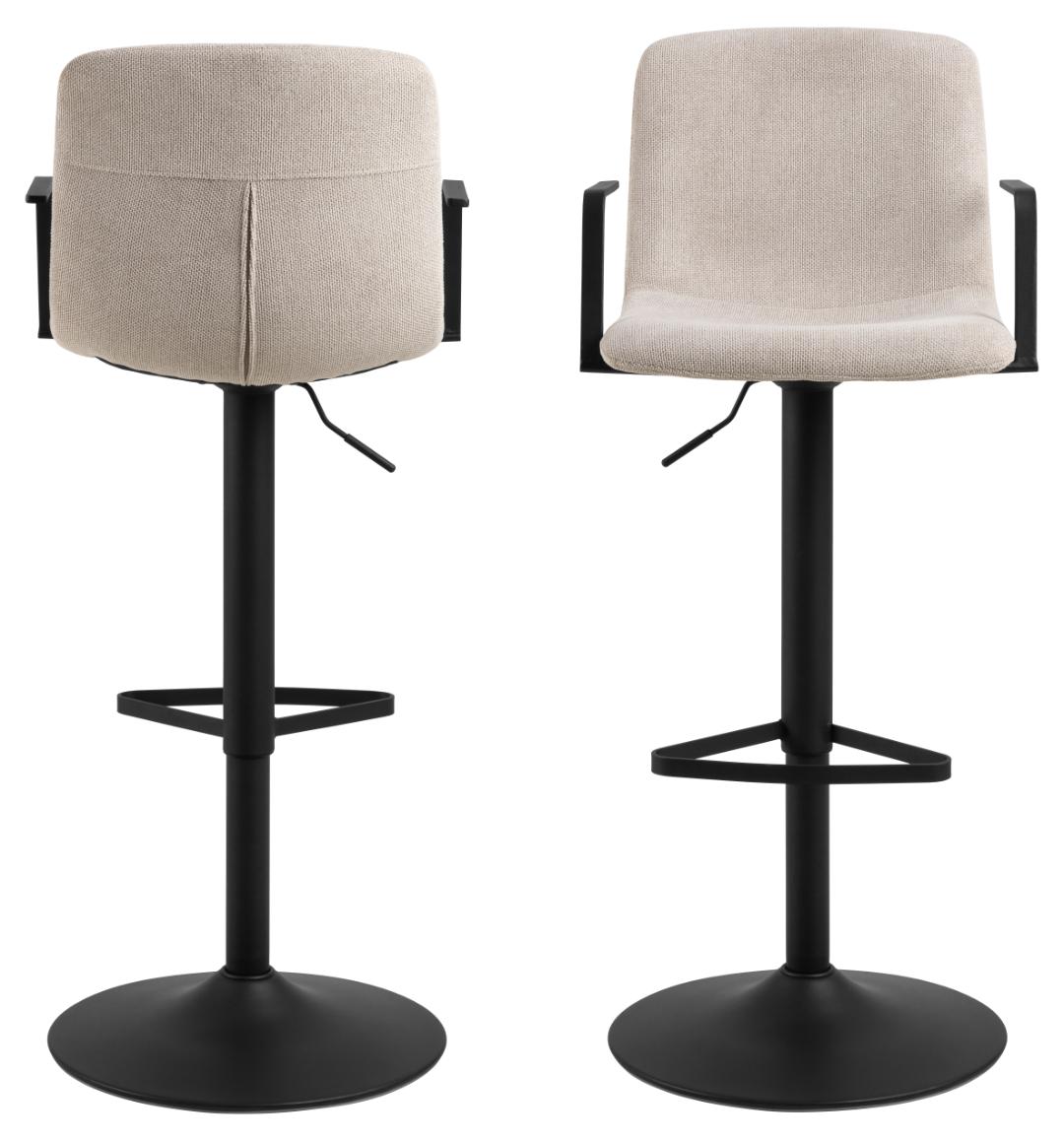 Sgabello da bar Pablo, tessuto Caso beige 3 FR, base a tromba in acciaio ruvido nero opaco verniciato a polvere, con alzata a gas, maniglia, girevole e cerniera, confezione 2 pezzi