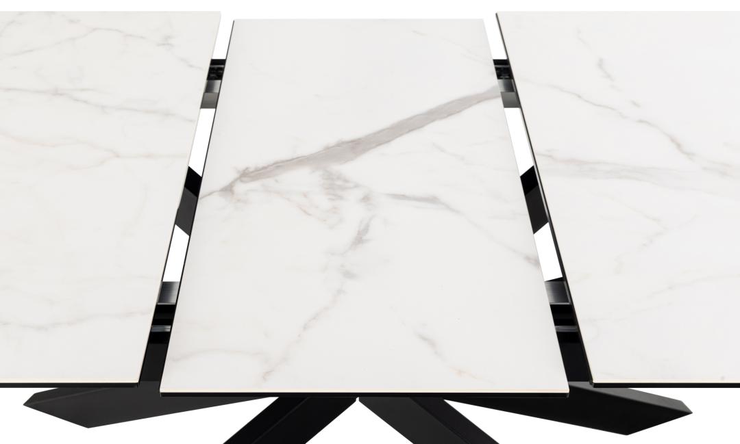 La superficie è resistente al calore e ai graffi e richiede poca manutenzione. Basta tirare delicatamente l'estremità del tavolo e la prolunga in ceramica abbinata apparirà al centro. Il look è completato dalla base a croce in metallo nero, posizionata in modo da permetterle di sedersi comodamente intorno al tavolo.