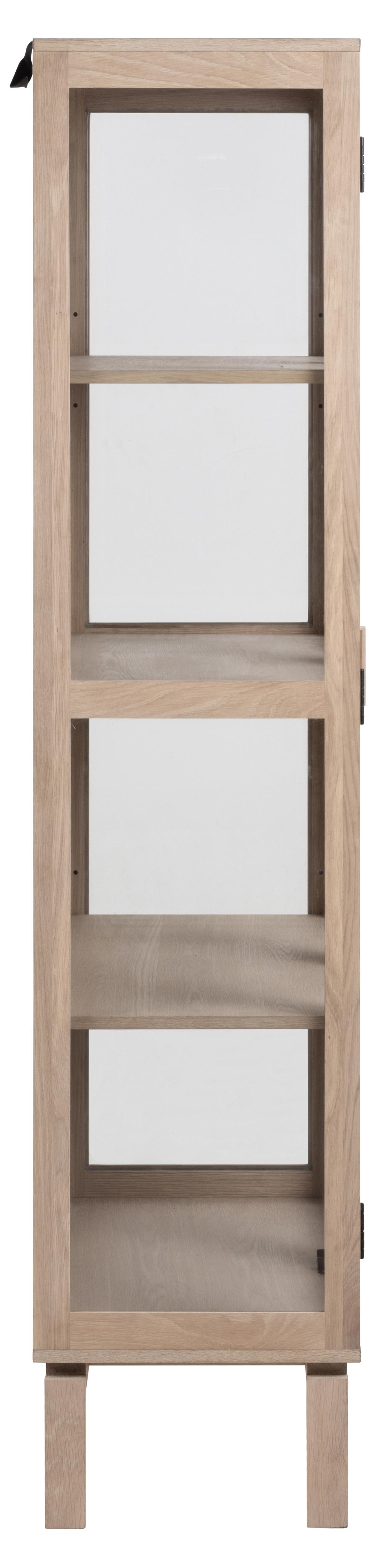 Vetrina Linley, piano, struttura e 3 ripiani impiallacciati rovere oliato pigmentato bianco, 2 ante vetro temperato trasparente, base rovere oliato pigmentato bianco, con schienale a lamelle, 80x40x180 cm